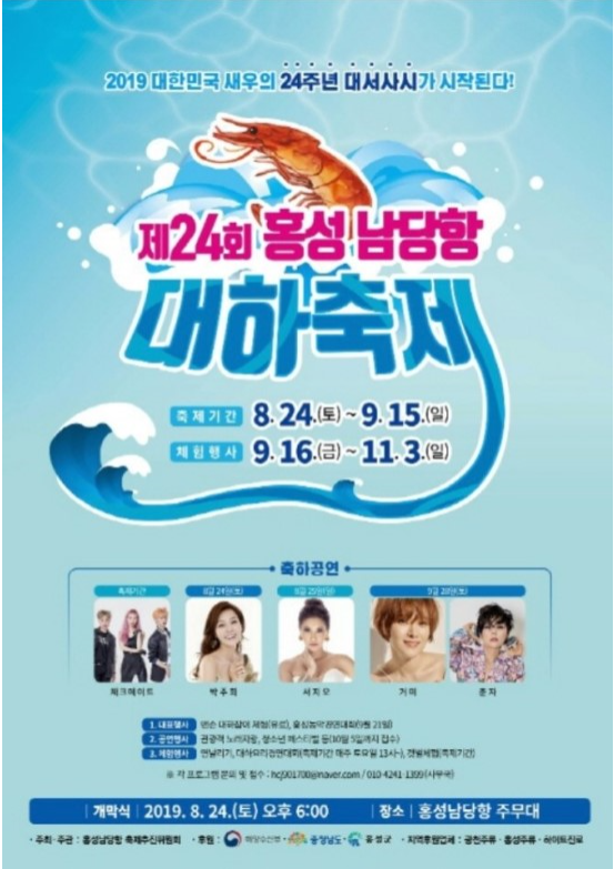 안녕하세요 하준스입니다. 드디어 한 주가 가고 주말이 되었는데요. 축제를 즐기기 위해 이곳 저곳 알아보는 분들도 꽤 있을거란 생각을 해요. 이번에 추천해 드릴 축제는 많은 사람들이 좋아할 만한 축제 중 하나인데요. 바로 2019 홍성남당항대하축제 랍니다. 2019 홍성 남당항 대하축제는 제 24회를 맞이하였다고 하는데요. 지금부터 중요한 부분들을 같이 알아보도록 해요.