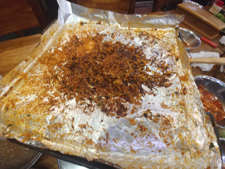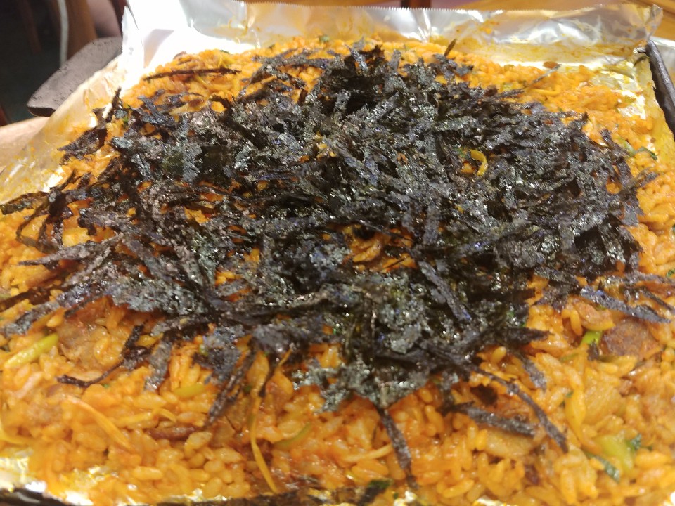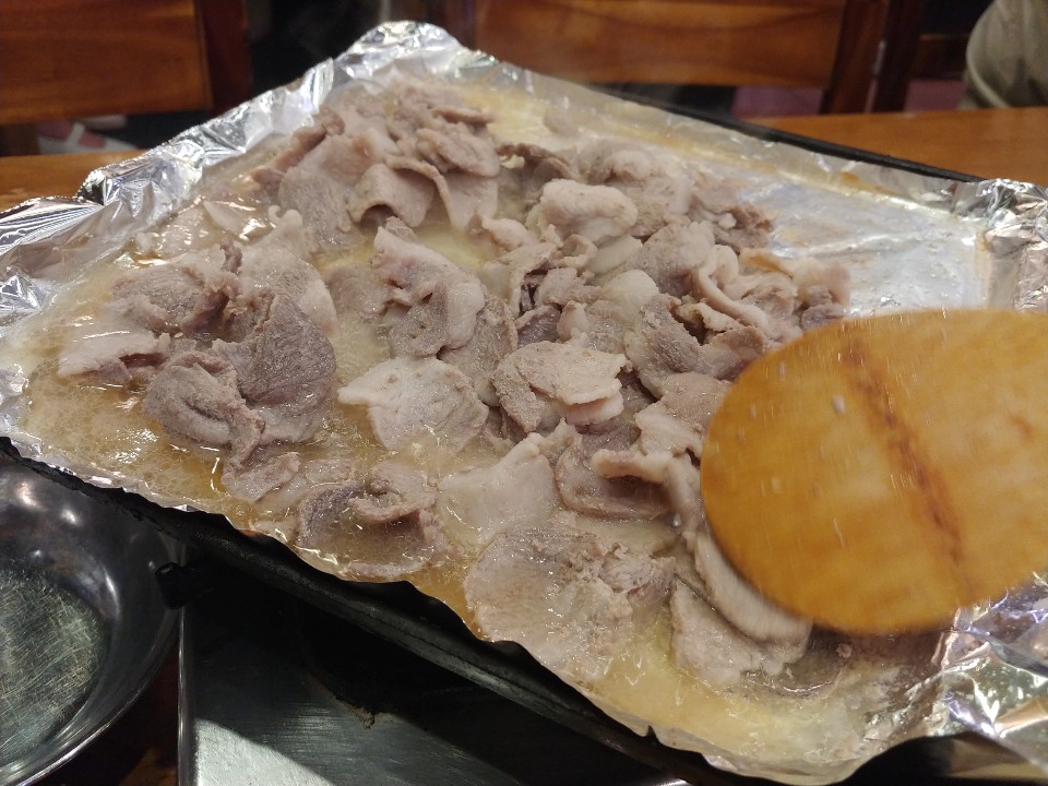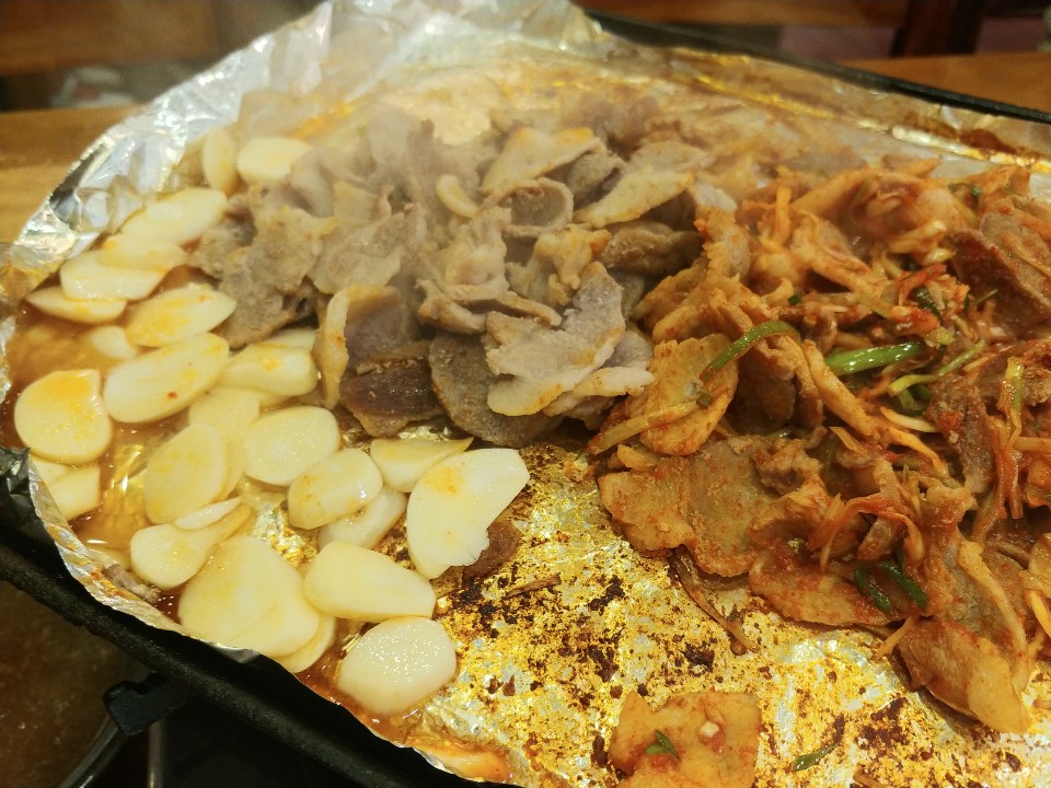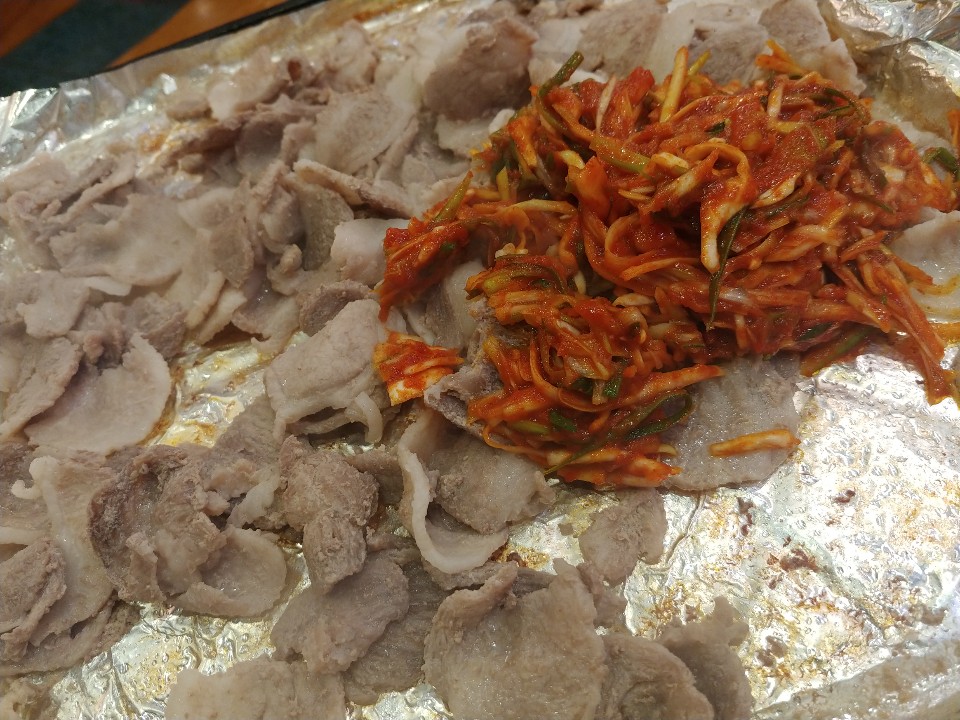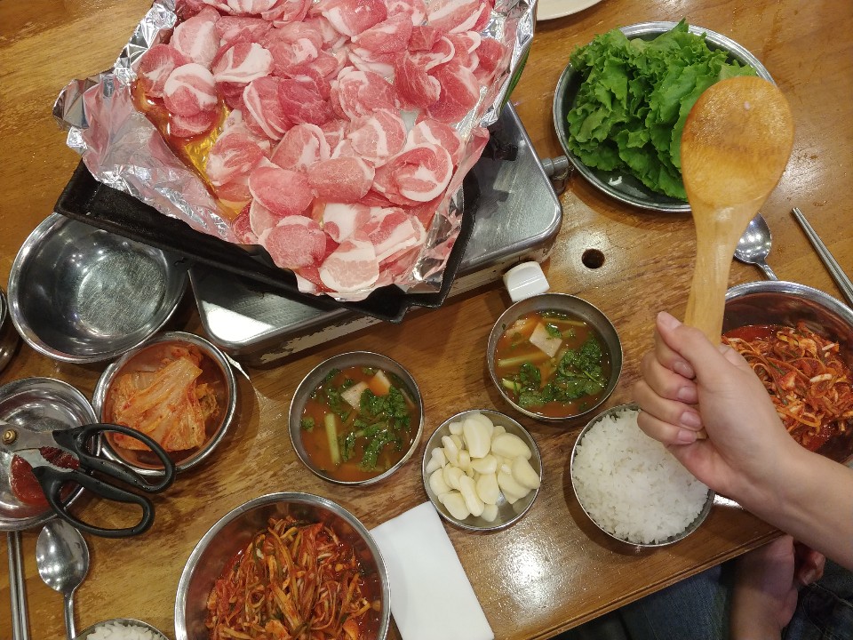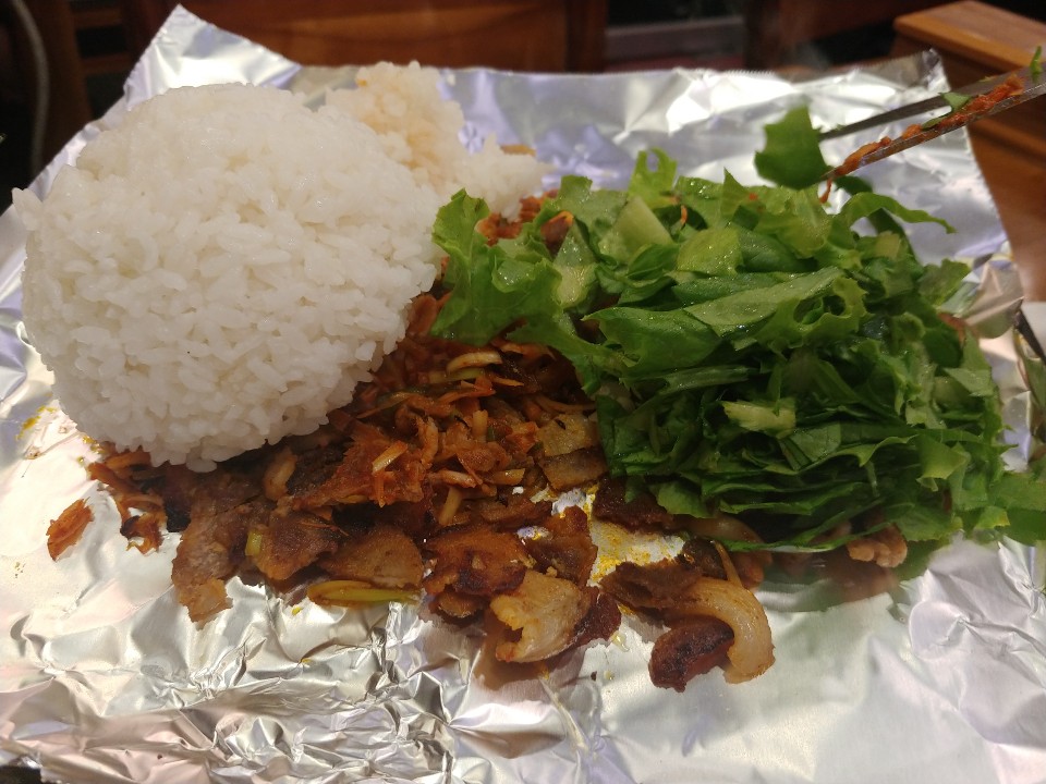 마늘도 올려주고 같이 구워줘요. 하준스는 쌈 싸먹는 것을 좋아하는데요. 한입을 먹더라도 양껏! 그리고 푸짐하게! 맛있게!를 강조한답니다. 쌈이 작은편이 아닌데 얹어놓은게 많아서 그런지 쌈이 작게 느껴지네요. 흐흐. 이렇게 한쌈 두쌈 먹다 보면 적은 양이 아닌데도 금방 양이 줄어요. 절대 흡입을 한게 아닙니다!!!! 돼지고기를 어느정도 먹고나면 이제 볶음밥을 먹어야 할 차례인데요. 볶음밥은 처음에 준 공기밥을 그대로 쓰셔도 좋구 볶음밥을 따로 시키셔도 된답니다. 볶음밥 재료를 달라고하면 친절한 이모님께서 볶음밥 재료를 가져다 주셔요.
