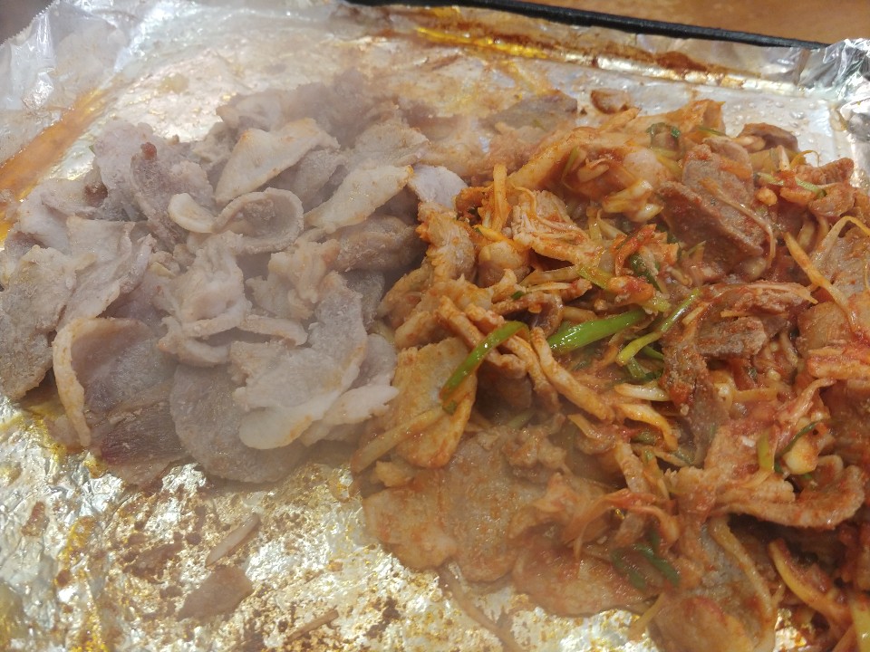 돼지고기가 맛있게 익은것같다면 맛있게 먹는 방법처럼 파절임을 같이 넣고 볶아줘요. 거의 철판요리급인데요. 하준스는는 봉용불고기의 본연의 맛도 고싶어서 반반으로 볶아봤어요. 파절임을 같이 조리한 봉용불고기는 양념과 함께 약간 매콤하면서 불고기양념이 같이 조리가 되어 달달한 맛이 느껴졌구요. 원조 봉용고기의 맛은 담백하면서 고기의 식감을 고대로 느낄 수 있어서 좋더라구요. 이건 여러분의 취향대로 먹어주면 좋을 것 같아요.