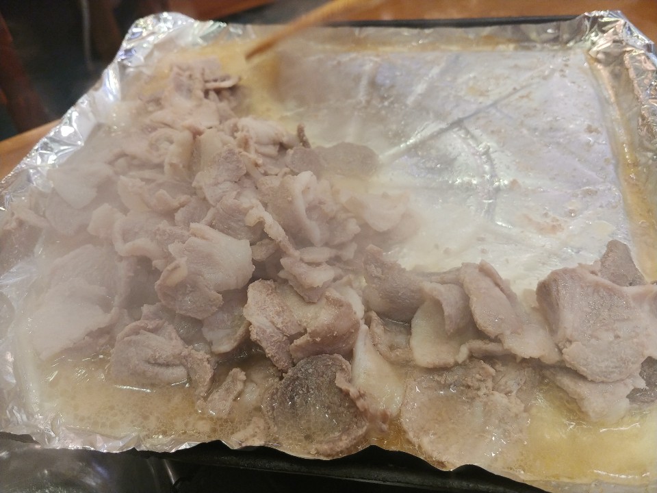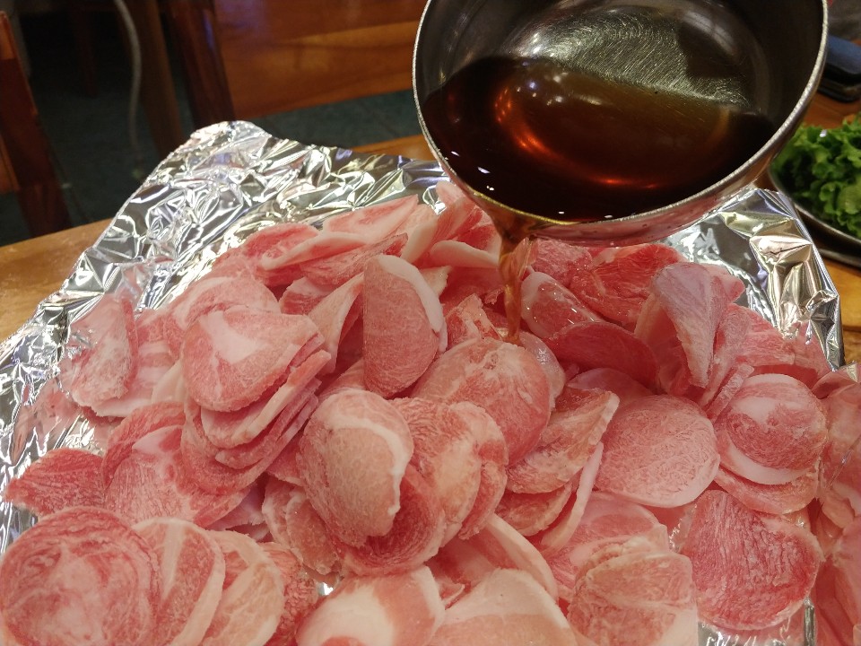 우암동봉용불고기의 한상차림이 드디어 완성형이 되었어요. 조리를 하기 위해 준비가 된 모습인데요. 이제 돼지고기를 조리해 볼 거에요.우암동봉용불고기에는 우암동 봉용고기만의 불고기 양념소스가 같이 나온답니다. 철판위에 돼지고기를 올려두고 돼지고기를 달래듯이 살살 뿌려주면 돼요. 맛있게 구워져라. 후훗