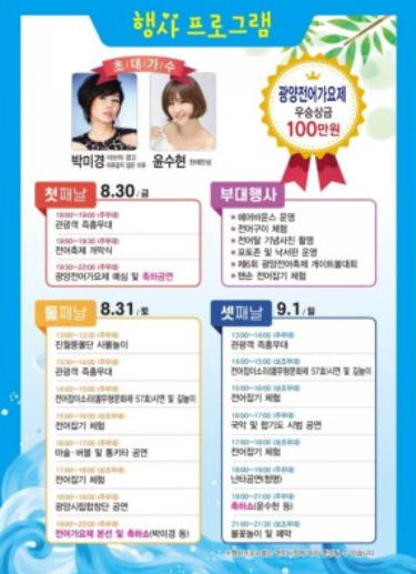 광양 전어 축제 또한 축제다보니 각종 프로그램과 행사가 있는데요. 8월 30일 19시 개막식을 시작으로 진행된다고 합니다. 그 중에서도 눈여겨 볼 것 중 하나는 광양 전어 가요제인데요. 둘째날 토요일부터는 사물놀이와 마술 , 버블 및 통기타 , 광명시립합창단의 공연을 볼 수 있고 중간중간 전어잡기 체험을 할 수 있다고 해요. 이 중에서도 눈여겨 볼 만한 행사프로그램은 바로 광양전어가요제인데요. 우승상금이 무려 100만원이라고 합니다. 노래 잘 하시는 분들은 서 모여주세요!!! 9월 1일 마지막 날에는 무형문화재 57호인 전어잡이 소리와 길놀이를 경험 할 수 있으며 국악 및 합기도 그리고 강한 에너지를 느낄 수 있는 난타공연을 볼 수 있다고 해요. 토요일 일요일 각각 가수 박미경 , 윤수현의 공연을 볼 수 있다고 합니다. 9월 1일 마지막 날엔 축제의 하이라이트인 불꽃놀이와 함께 폐막식을 한다고 해요.