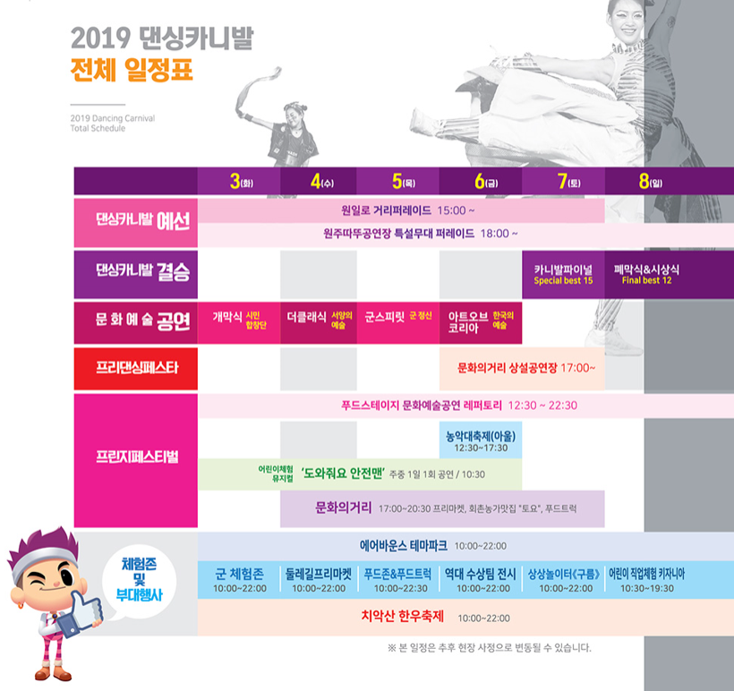 2019 원주 다이내믹댄싱카니발의 전체일정표랍니다. 일정표를 보니 벌써부터 설레기 시작하네요. 9월 3일 화요일 원주시민합창단의 개막식으로 8일엔 시상식과 폐막식을 동시에 진행합니다.