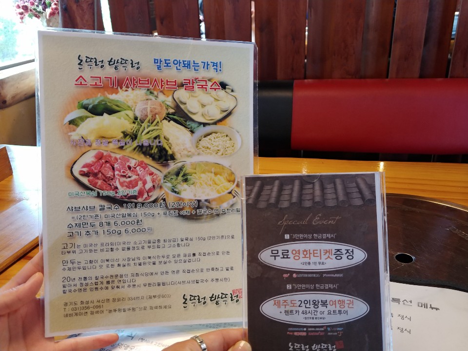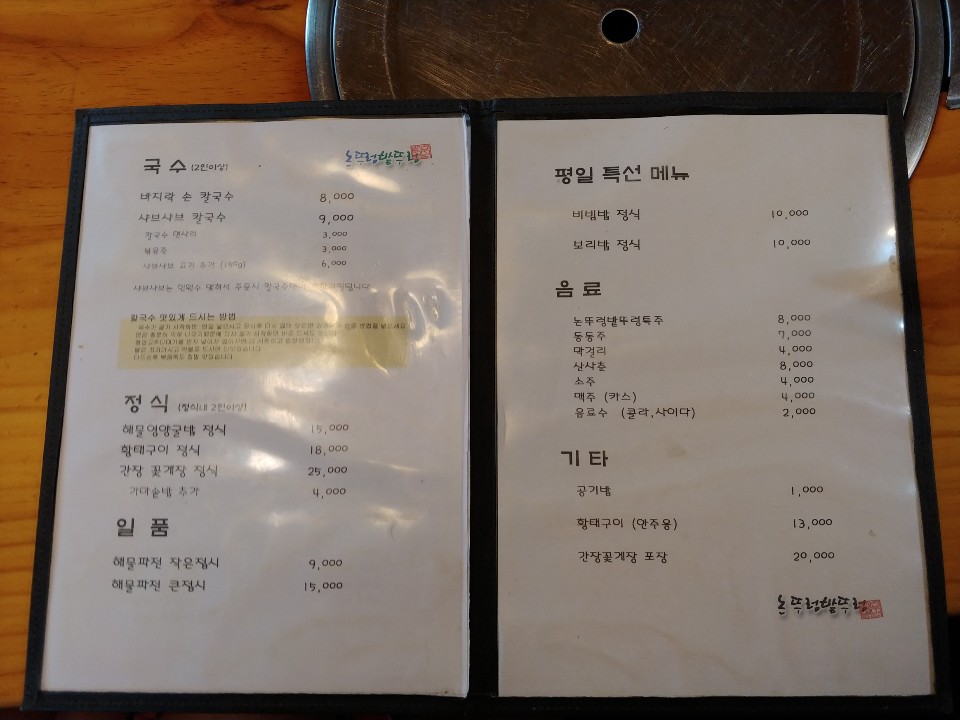 들어오자마자 바로 자리에 앉을 수 있었어요. 테이블을보니 고기를 구워먹고 싶어지더라구요. 그때 아마 고기가 있었다면 고기를 제일 먼저 먹고싶었을 것 같아요. 하핫. 자 이제 메뉴를 볼게요. 메뉴판을 보면 국수 정식 일품 평일특선메뉴 등등이 있는데 평일 특선메뉴는 주말이어서 먹을 수 없었어요. 사람들이 많이 찾는 음식이 뭔가 보니까 황태구이와 소고기 샤브샤브 칼국수를 많이 먹더라구요. 황태구이의 양념이 너무 맛있게 보여서 황태구이 정식을 2인분 주문했답니다.