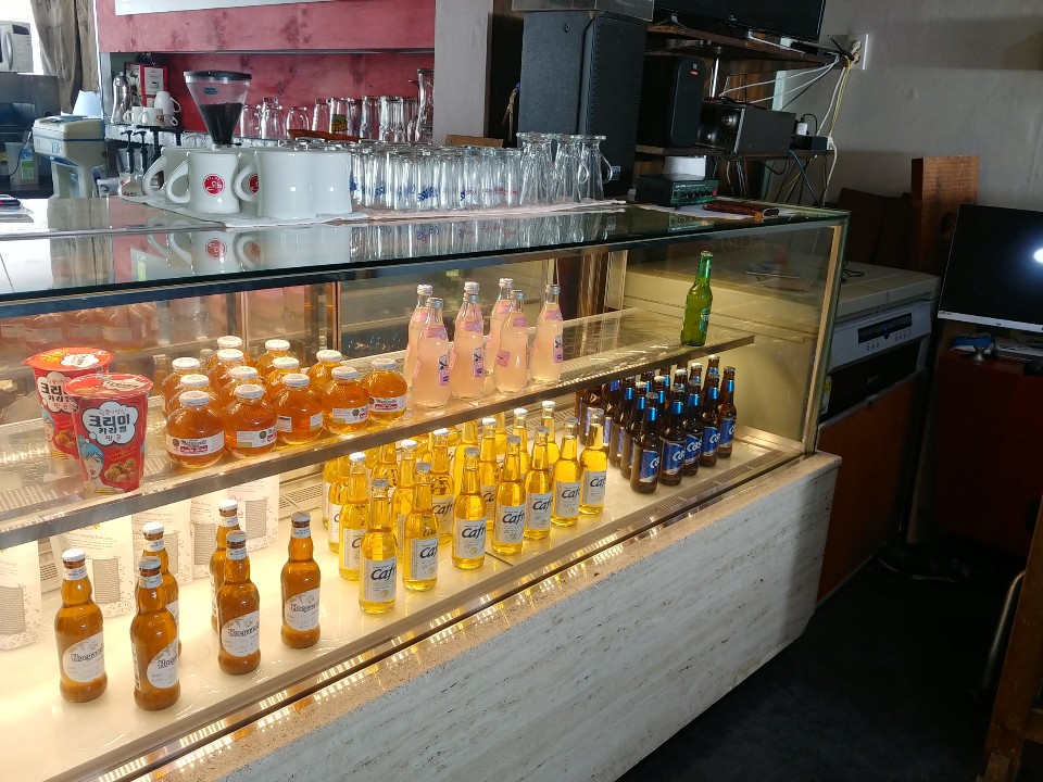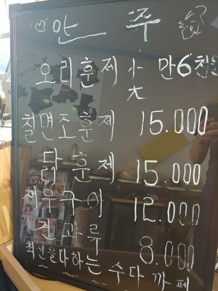 내부로 들어가면 안에 맥주도 판매를 하고 있더라구요. 더욱 인상깊었던 것은 훈제요리들이 판매하고 있다는 점! 카페는 카페지만 가볍게 술 한잔을 즐길 수 있게 준비 되어 있답니다. 제부도를 떠나는 날이기 때문에 안주와 술을 주문하진 않았지만 바다풍경을 보기위해 음료 두잔을 주문했어요.