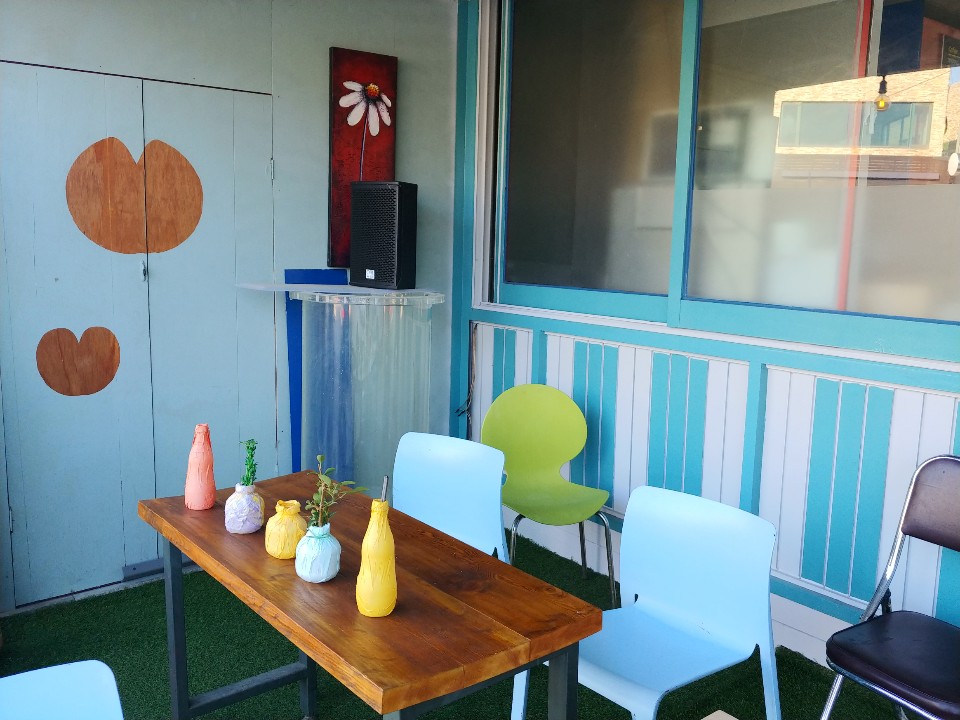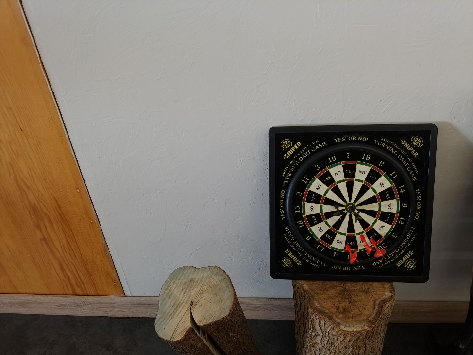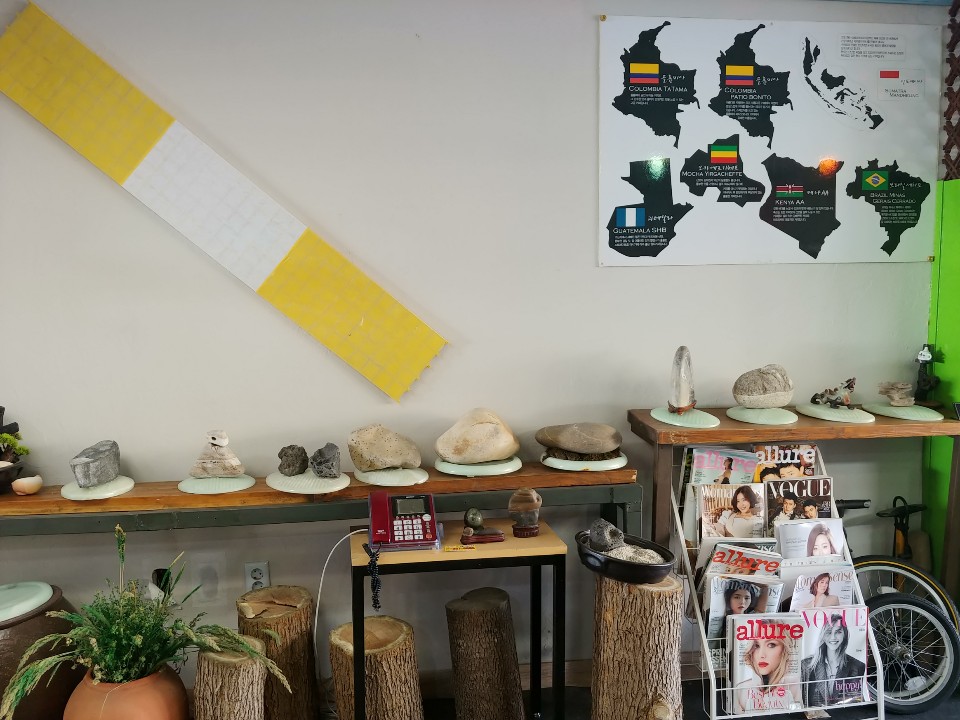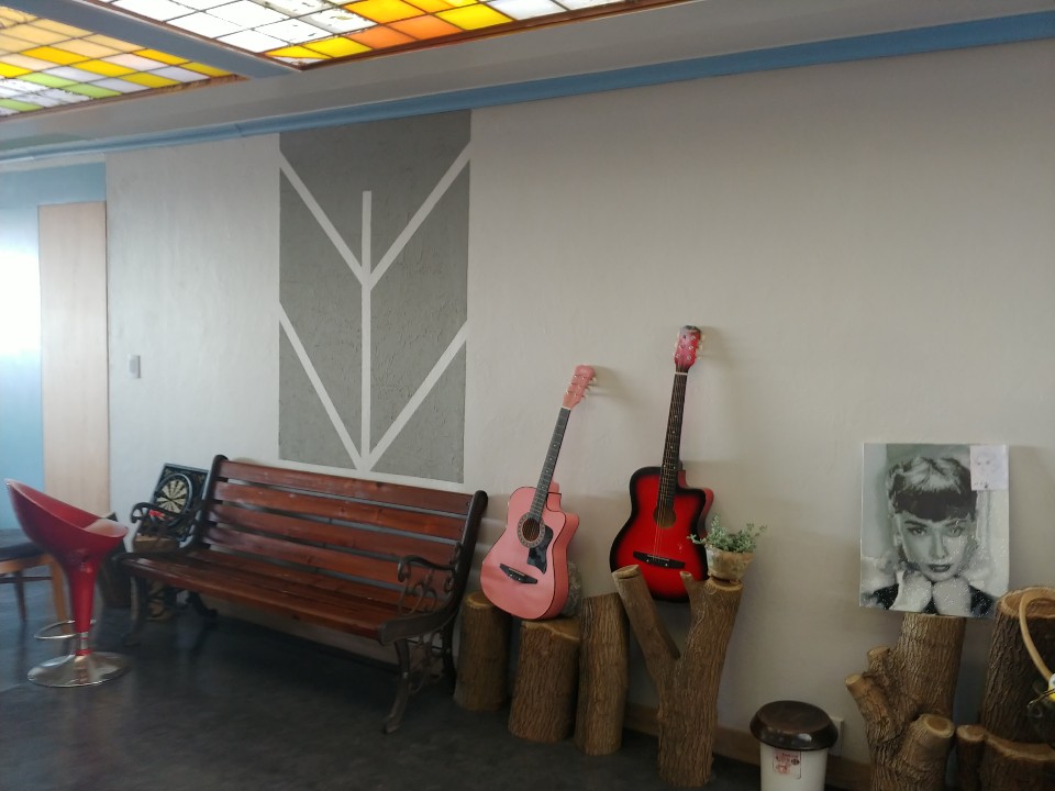 곳곳에는 큰 돌들이 많이 배치되어 있더라구요. 심지어는 테이블 위에두요. 독특한 인테리어가 눈에 많이 들어왔어요. 아기자기하게 많은 소품들이 곳곳에 배치되어 있고, 가을 감성을 느낄 수 있는 벤치와 커플기타가 눈에 들어오네요. 벤치에 앉아서 기타를 치면 운치 있을 것 같다는 생각이 들었어요. 또 그 옆에는 다트가 있었는데요. 나중에 엄마와 5살정도로 보이는 꼬마 아이가 다트 앞에 사이좋게 앉아서 다트를 던지며 놀구 있는 모습을 보는데, 그 모습을 보면서 나중에 미래에 저랬으면 좋겠다는 생각이 들더라구요. 그만큼 너무 보기 좋았어요.
