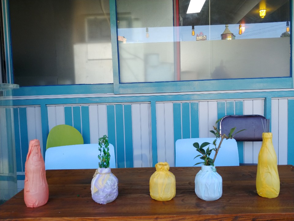 제부도 입구 씨월드 앞에를 보면 길 건너에 넓은 주차장들과 함께 많은 횟집이 있답니다. 그 횟집은 대부분 한 라인으로 바다를 보면서 식사를 할 수 있게 되어 있는데요. 그중에서 우연히 하준스의 눈에 들어 온 자그마한 카페 하나. 바로 SUDA ( 수다 ) 카페 , SUDA ( 수다 ) 카페는 바다 또는 바다 위 하늘을 연상시키게 하는 하늘색으로 인테리어 되어 있고 아기자기하게 병들을 색옷을 입혀 인테리어가 되어 있답니다.