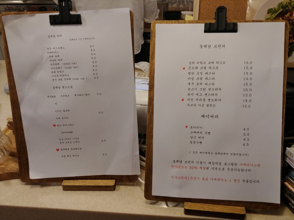 청주 동백당의 메뉴판은 이렇게 되어있어요. 가격이 잘 보일진 모르겠지만, 브런치부터 음료까지 다양하게 즐길 수 있더라구요. 브런치가 있던 점이 저는 좋게 보였어요. 식사를 하면서 한옥을 이 아늑함을 즐길 수 있다는 점에서요. 그렇게 망고바나나스무디와 아이스아메리카노를 주문했답니다.