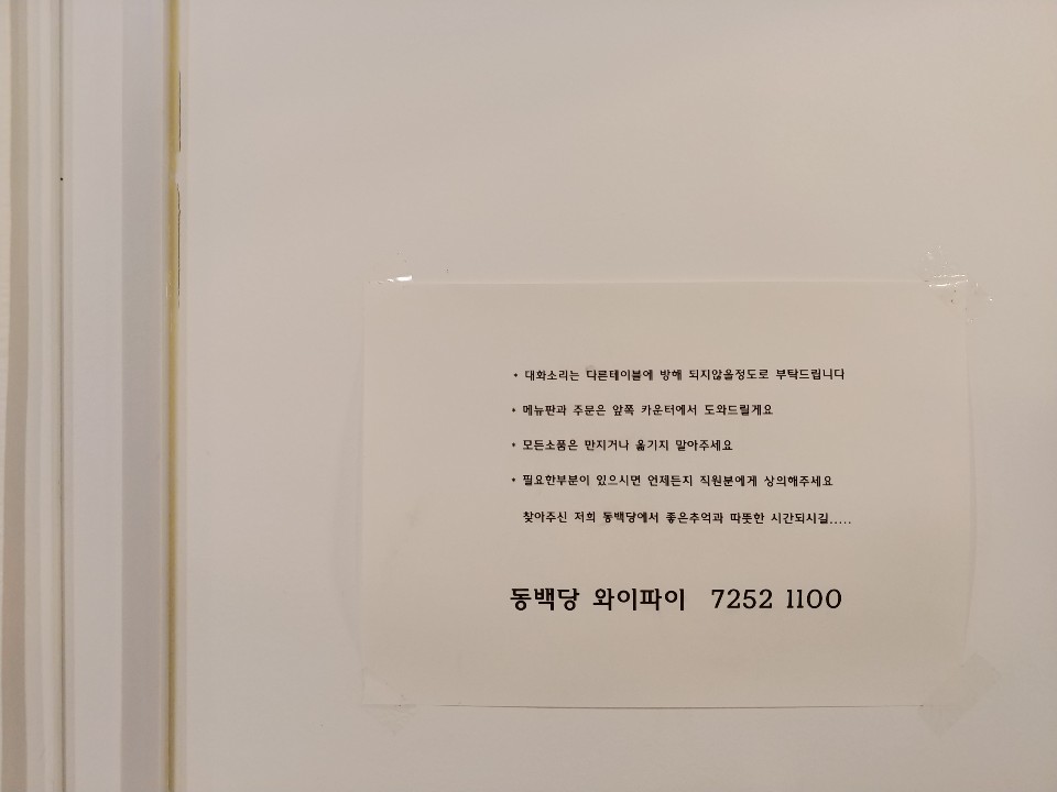 대성로는 또 시내와 가깝다보니, 이쁜 카페들이 당연히 많을 수밖에 없겠지만, 약간 도시를 벗어나는 듯한 느낌이 들어 맘도 편안해지고 좋기때문에 여러분들께도 추천을 해볼게요. 마지막으로 청주동백당의 와이파이 번호랍니다. 분명 이거 찾으시는 분들 계실거다. 그쵸? 하준스는 이렇게 동백당 구경을 마치고 기다리고 있는 그분의 옆으로 돌아갔답니다.